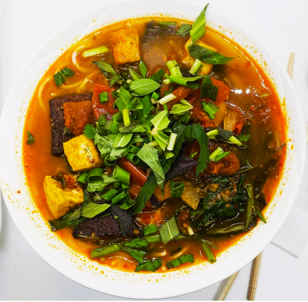 With fresh water spinach and thick rice pasta. Refined with different herbs.
